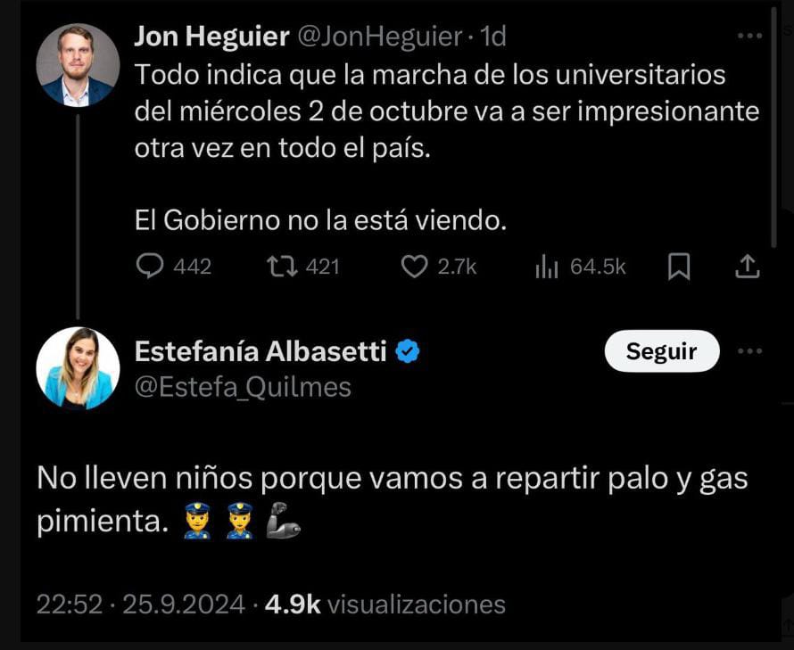 Desde la casa de estudios recordaron que se trata de la misma concejala que el 25 de setiembre último, en el marco de la marcha universitaria contra el veto de Milei, en redes sociales amenazó: “no lleven niños porque vamos a repartir palo y gas pimienta”. Parece que esta vez lo pudo concretar.